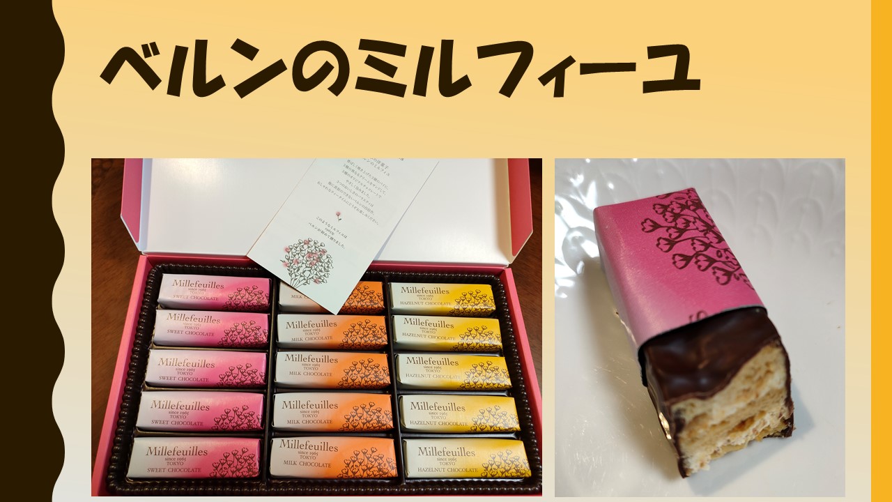 バレンタインデーに妻がベルンのミルフィーユを買ってきてくれた。私はこのベルンのミルフィーユが菓子の中で最強だと思っている。三層のさくさくとした歯ごたえのパイ生地にチョコレートのコーティングがしてあり、冷蔵庫で冷やすと表面のチョコレートもパリッとしてまた違ったおいしさが味わえる。