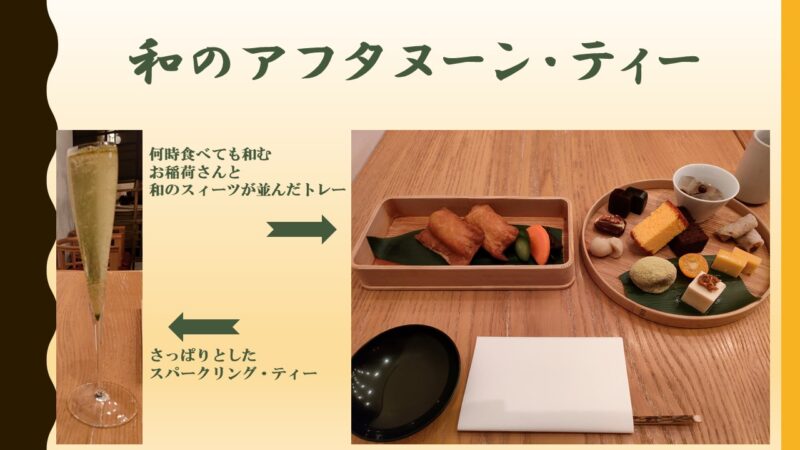 前日ネットで予約をとする際に、ほぼ満席で15:30入店がわずかに2席の空きとなっていたところに滑り込むことができた。一人5,200円のコースの中身は、爽やかな飲み口の『煎茶スパークリング』、味染みお揚げにくるまれたお稲荷さん。間食として和のスーツの盛り合わせに、たくさんあるお茶の中から2種類を選んでいただくことができる。